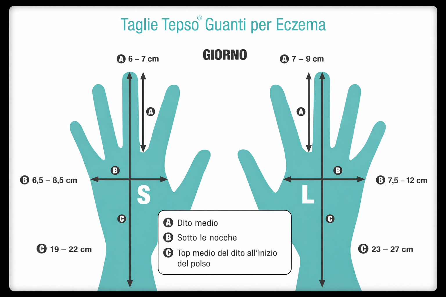 I guanti per eczema Tepso® Premium sono molto elastici, l'indicazione della taglia nelle misure convenzionali dei guanti non ha senso. La taglia S copre tutte le taglie da donna, la taglia L tutte le taglie da uomo.